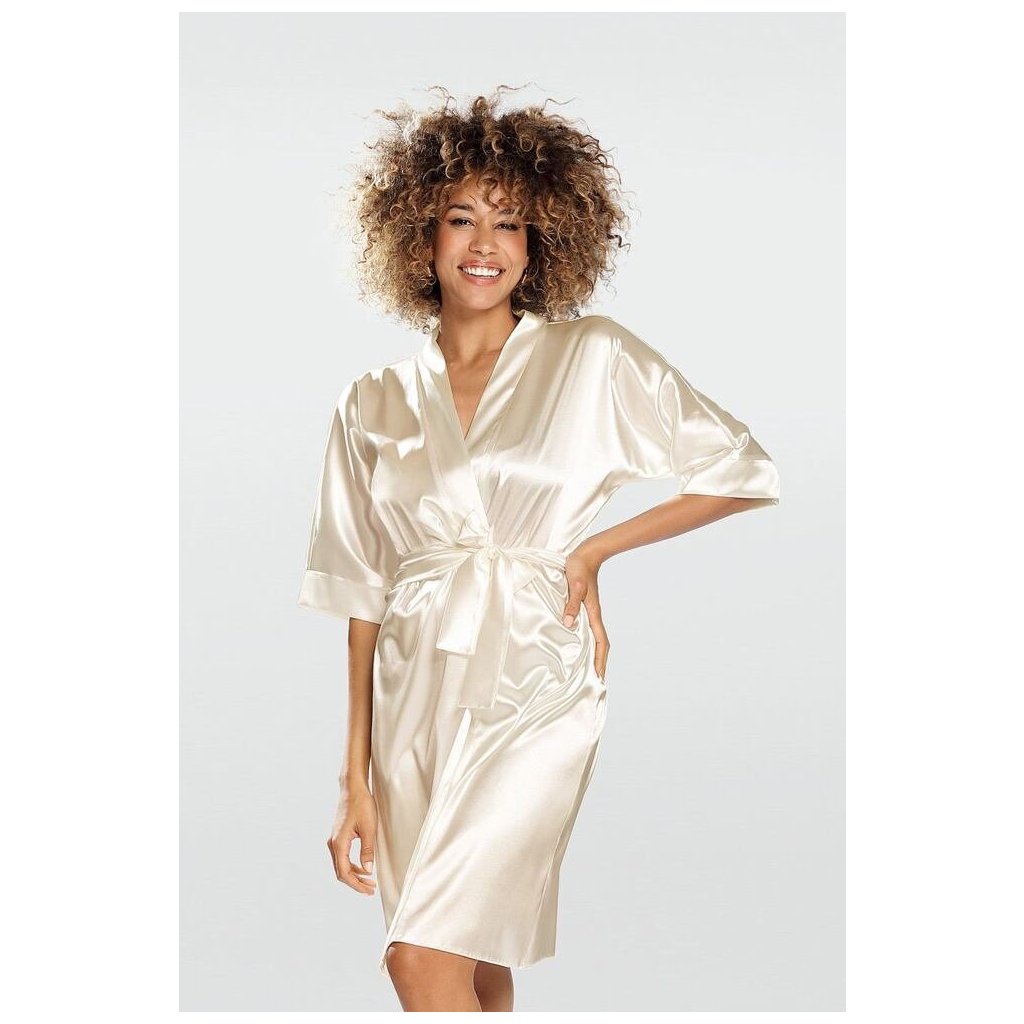 Pohodlný saténový župan je dlouhý 100 cm, má zajímavou ecru barvu a luxusní vzhled.