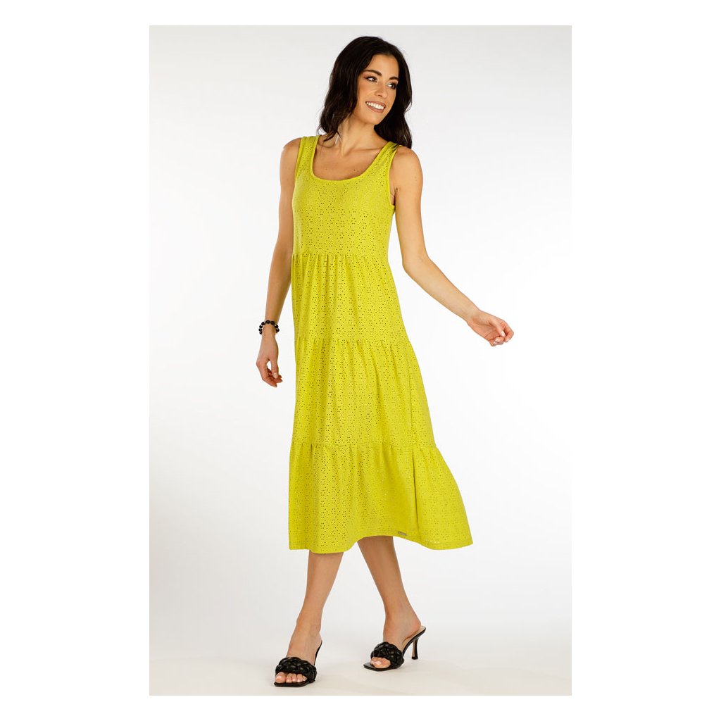 Elegantní volné dámské šaty s kanýry a délkou do půl lýtek. Působivý děrovaný vzor dodává šatům nezaměnitelný styl a šarm. Materiálové složení zaručuje dokonalou prodyšnost, maximální komfort při nošení a jednoduchou údržbu. Velmi stylový a komfortní kousek, který skvěle doladí Váš letní outfit. Délka šatů cca 115 cm. 95% Polyester + 5% Elastan 104 žlutozelená S, M, LDoplňkové parametry