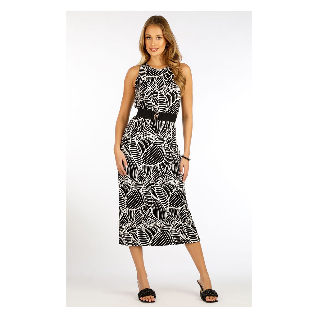 Jednoduchý střih šatů s vykrojenými průramky a kulatým výstřihem v maxi délce. Viskózový úplet s příměsí elastanu je příjemně měkký, pružný a při nošení velice komfortní. Abstraktní černobílý tisk je nadčasový a lehce kombinovatelný, který stylově osvěží Váš letní šatník. Možno nosit s páskem, který není součástí šatů. Délka šatů cca 120cm. 95% Viskóza + 5% Elastan černobílý tisk S, M, L, XLDoplňkové parametry