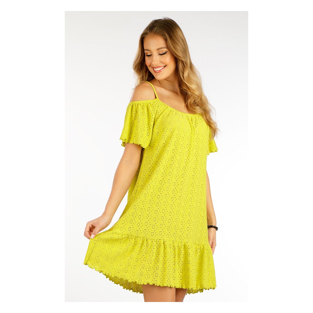 Krásný letní střih s nastavitelnými ramínky a volánem v délce šatů. Vzdušný děrovaný materiál zaručuje dokonalou prodyšnost, maximální komfort při nošení a jednoduchou údržbu. Možné nosit i jako plážové šaty. Délka šatů 85 cm. 95% Polyester + 5% Elastan 104 žlutozelená S, M, LDoplňkové parametry