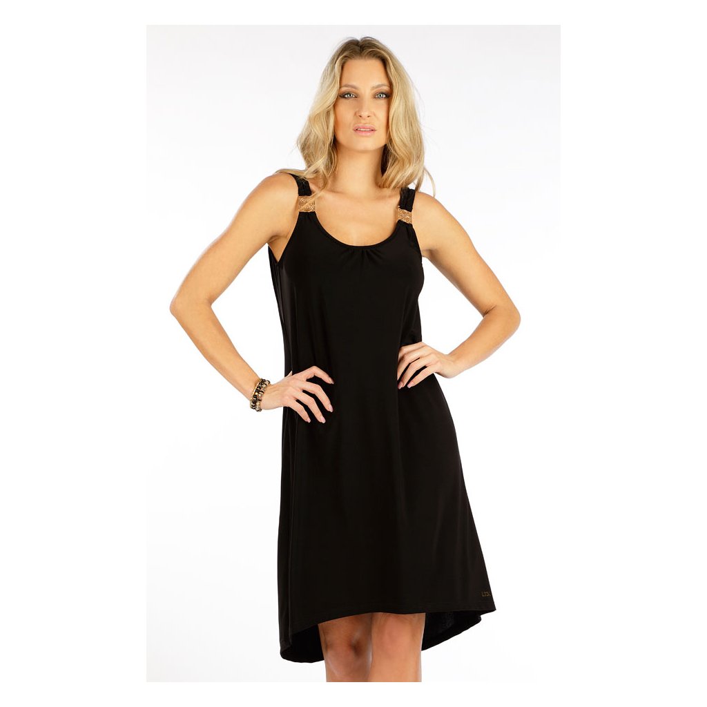 Širší ramínka se zlatým ozdobným doplňkem. Volný střih s řasením ve výstřihu předního dílu a velký výstřih do V na zadním dílu. Delší zadní díl. Velmi splývavý a pružný nemačkavý materiál Vám zajistí maximálně příjemný pocit při nošení. Možné nosit i jako plážové šaty. Délka šatů cca 105 cm. 95% Polyester + 5% Elastan 901 černá S, M, L, XLDoplňkové parametry