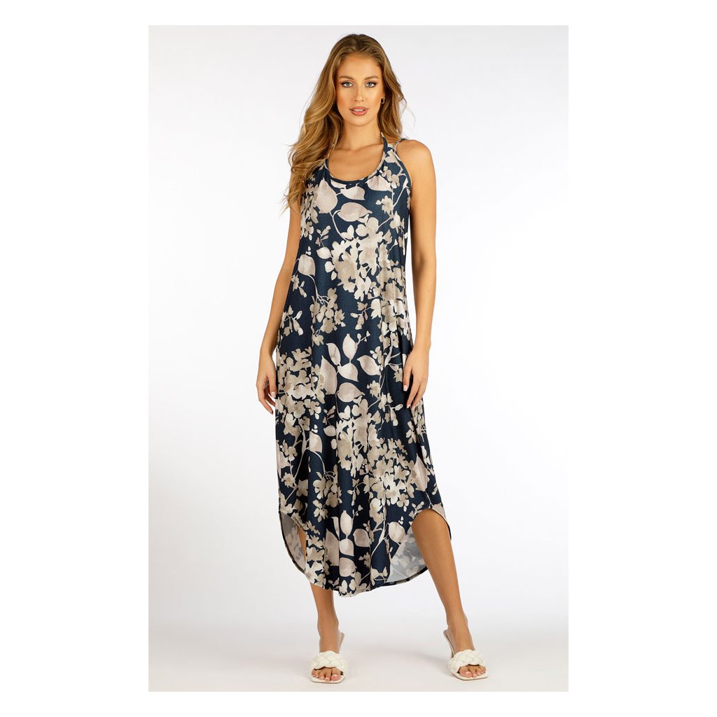 Originálně řešený ramínka se zavazováním za krk. Volný střih s kulatým výstřihem na předním dílu a velký výstřih do V na zadním dílu. Tvarovaná délka šatů. Velmi splývavý a pružný nemačkavý materiál Vám zajistí maximálně příjemný pocit při nošení. Délka šatů cca 120 cm. 95% Polyester + 5% Elastan béžová kytka na tmavě modré S, M, L, XLDoplňkové parametry