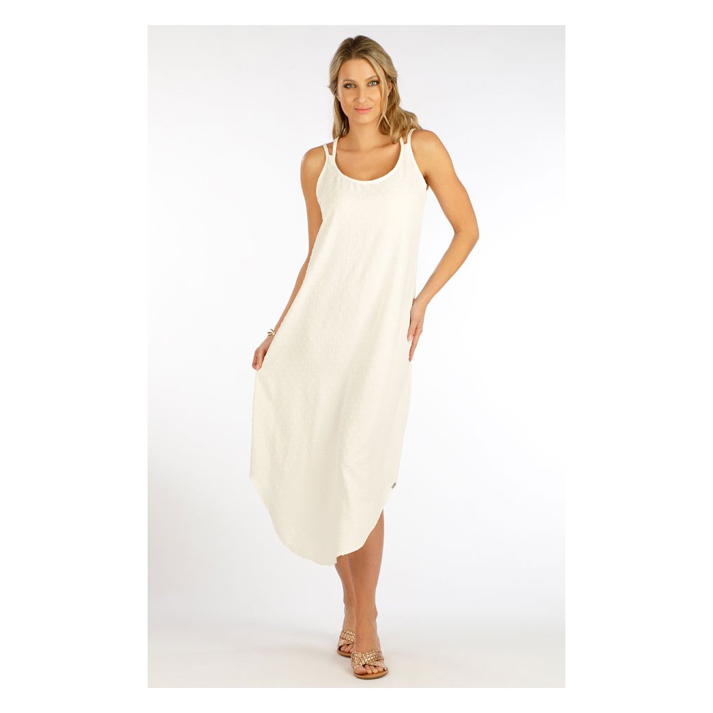 Působivé romantické šaty volného střihu na ramínka se zavazováním za krk. Tvarovaná délka šatů. Vytkávaný lehký materiál zaručuje originalitu a maximální komfort při nošení. Velmi nápaditý kousek, který stylově osvěží Váš letní šatník. Délka šatů cca 115 cm. 100% Polyester 101 smetanová S, M, LDoplňkové parametry