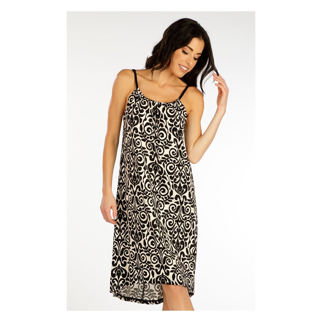 Nastavitelná černá ramínka. Volný střih s řasením ve výstřihu předního dílu a velký výstřih do V na zadním dílu. Delší zadní díl. Lehký tkaný materiál s vysokým podílem viskózy a přítomnost elastanu zaručuje neobyčejně příjemný pocit při nošení, je prodyšný a nemačká se. Délka šatů cca 105 cm. 97% Viskóza + 3% Elastan černý tisk na smetanové S, M, LDoplňkové parametry