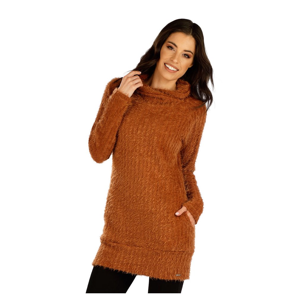 Překřížený stoják. Praktické boční kapsy. V délce šatů široká manžeta. Originální vzhled pleteniny s plastickým vzorem a hebkým, příjemným omakem. Délka šatů cca 80 cm. 100% Polyester 426 měděná S, M, L, XLDoplňkové parametry