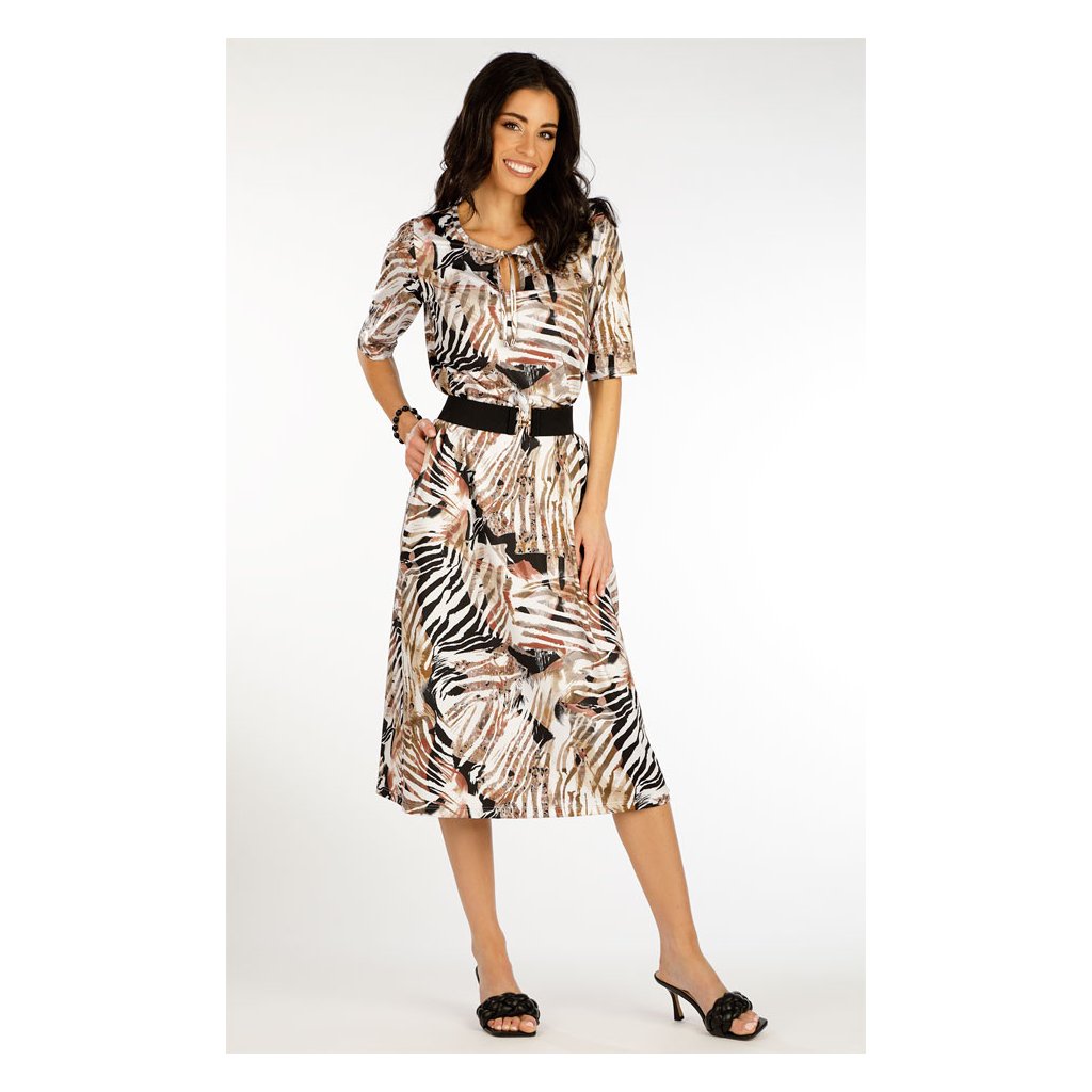 Elegantní dámské šaty s tvarovaným výstřihem a tkanicí na zavázání s ozdobnými koncovkami. Volný střih s bočními kapsami. Materiál se zvířecím motivem zaručuje dokonalou splývavost, pružnost a maximálně příjemný pocit při nošení. Šaty jsou velmi lehké, komfortní na nošení a praktické na údržbu. Možno nosit s páskem, který není součástí šatů. Délka šatů cca 115 cm. 95% Polyester + 5% Elastan hnědá zebra S, M, L, XLDoplňkové parametry