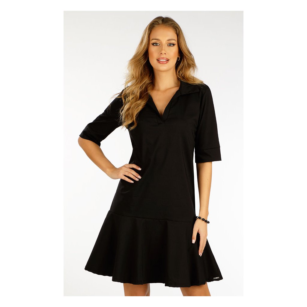 Elegantní dámské šaty s límečkem a ležérním výstřihem. V délce šatů volán, který dodává šatům nezaměnitelný styl a šarm. Materiál s vysokým podílem bavlny, která představuje záruku prodyšnosti a vysoce komfortního pocitu. Lehký a pružný materiál. Velmi nápaditý kousek, který stylově osvěží Váš letní šatník. Délka šatů cca 90 cm. 70% Bavlna + 26% Polyamid + 4% Elastan 901 černá S, M, L, XLDoplňkové parametry