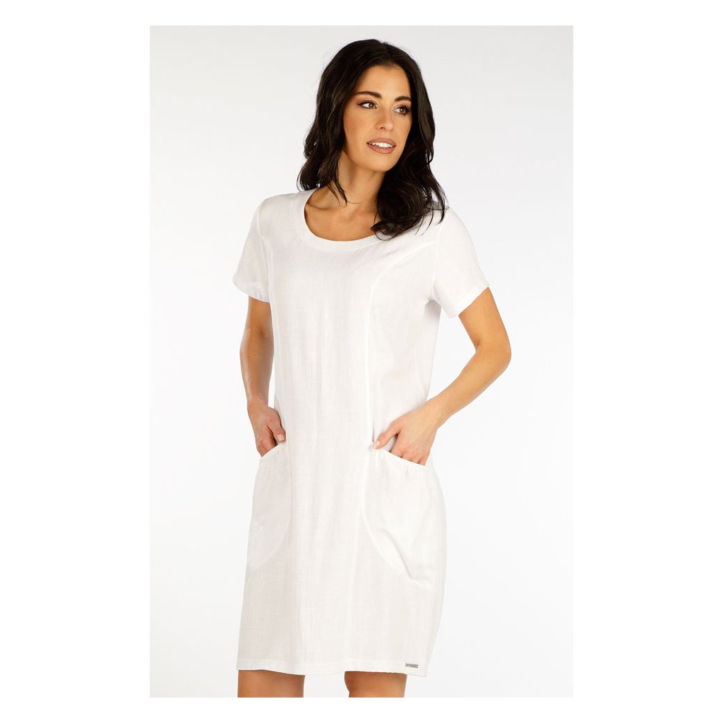 Členěné šaty volného střihu s kulatým výstřihem a řasenými kapsami. Materiálové složení zaručuje dokonalou prodyšnost, měkkost a příjemný pocit při nošení. Délka šatů cca 92cm. 70% Viskóza + 30% Len 100 bílá S, M, L, XLDoplňkové parametry
