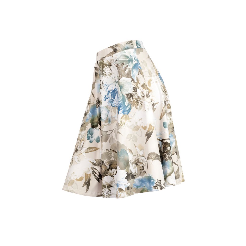 Elegantní rozšířená sukně po kolena s pružným pasem. Květinový potisk v přírodních barvách. Materiálové složení zaručuje dokonalou splývavost, lehkost a příjemný pocit při nošení. Jistě oceníte nemačkavost a jednoduchou údržbu. Výborně kombinovatelný a praktický kousek, který skvěle doladí Váš každodenní outfit. Délka sukně cca 58 cm. 88% Polyester Micro + 12% Elastan/ Lycra modrobéžový tisk S, M, LDoplňkové parametry