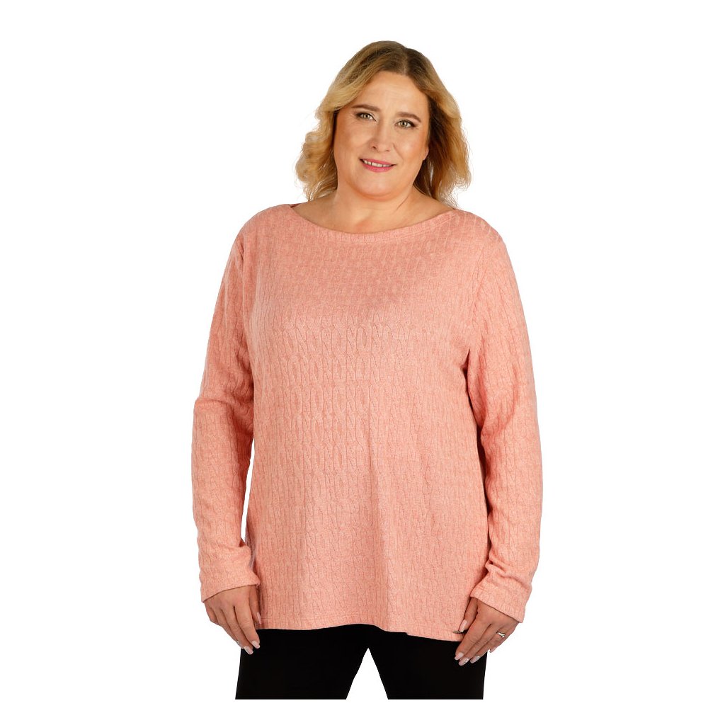 Lodičkový výstřih. Volný střih. Pletenina plastického copánkového vzoru s příměsí viskózy a elastanu je velmi příjemná na těle, velmi dobře pruží a nemačká se. Nabízíme ve větších velikostech. 49% Viskóza + 29% Polyester + 19% Polyamid + 3% Elastan 304 lososová XL, XXL, XXXLDoplňkové parametry
