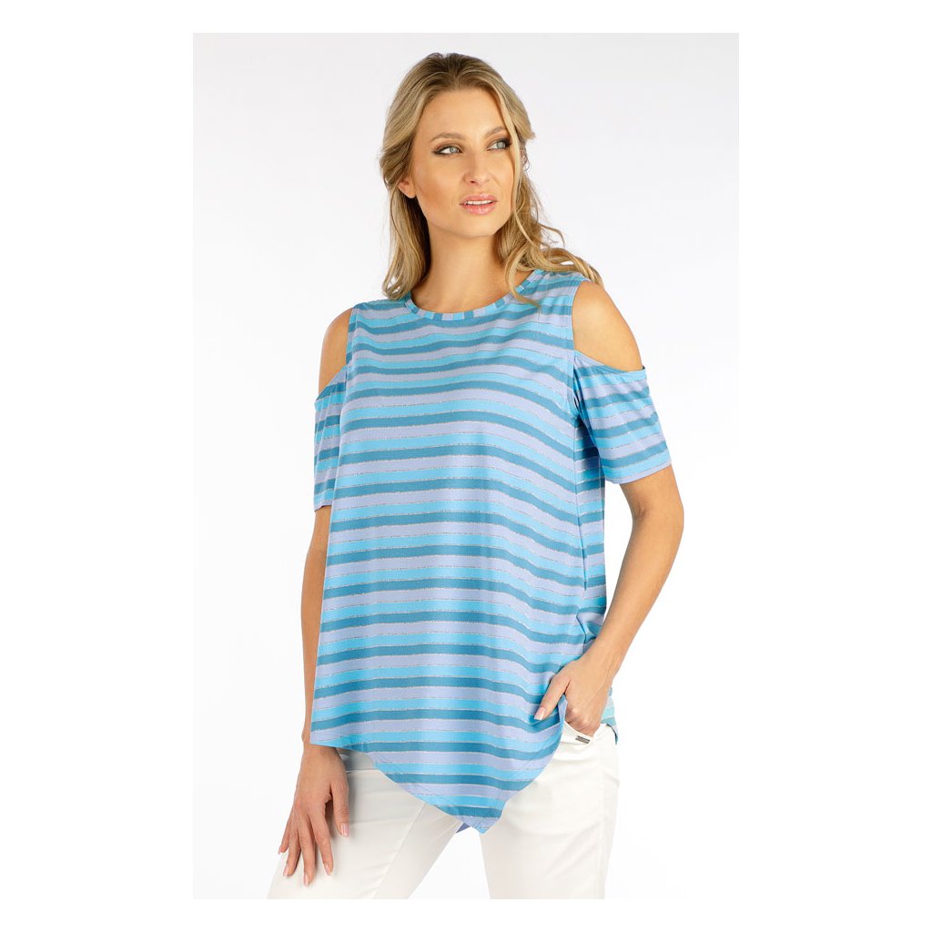 Triko volného střihu s efektivním členěním na ramenou. Kulatý výstřih a asymetricky řešená délka trika. Nadčasový vzor proužku v tyrkysových barvách se stříbrnou nitkou. Viskózový úplet s příměsí elastanu zaručuje dokonalý pocit při nošení. Výborně kombinovatelný a praktický kousek, který skvěle doladí Váš každodenní outfit. 86% Viskóza + 6% Elastan + 4% Metalické vlákno + 4% Polyamid modré pruhy s leskem S, M, LDiskuze