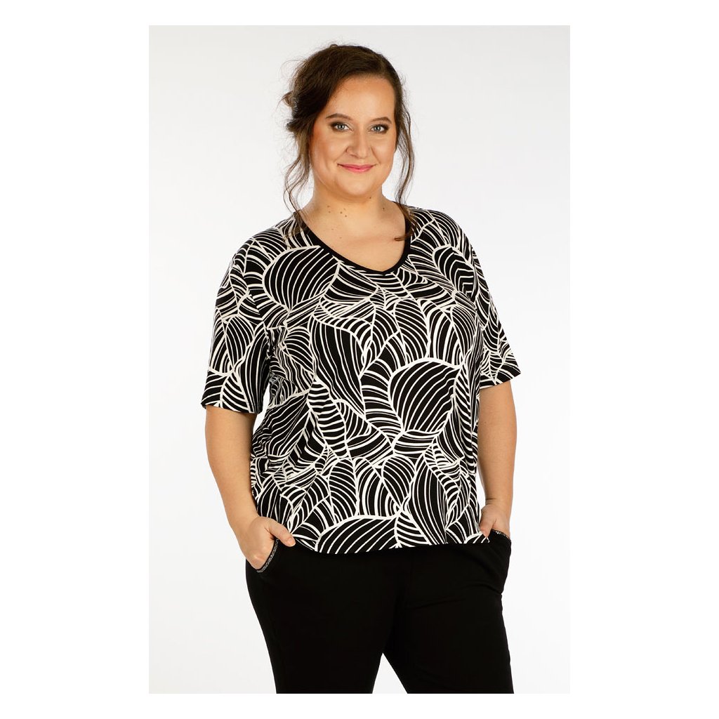 Volnější střih a výstřih do V. Viskózový materiál je příjemně měkký, pružný a při nošení velice komfortní. Abstraktní černobílý tisk je nadčasový a lehce kombinovatelný, který stylově osvěží Váš letní šatník. Triko nabízíme ve větších velikostech. 95% Viskóza + 5% Elastan černobílý tisk + černá XL, XXL, XXXLDoplňkové parametry