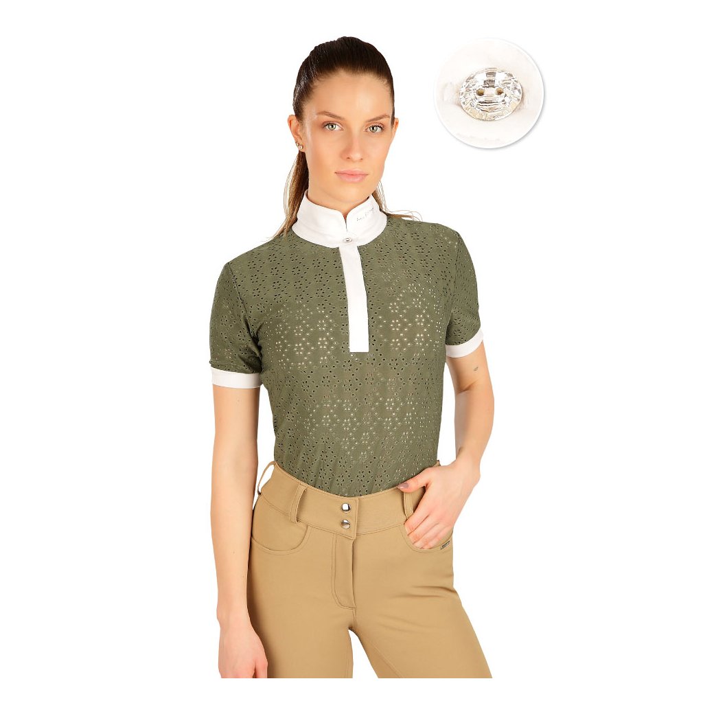Dámské závodní triko s krátkým rukávem do manžety. Elegantní propracované triko se stojáčkem se Swarovski knoflíkem a légou se zapínáním na knoflíky. Děrovaný materiál je velice prodyšný, pružný a nenáročný na údržbu. Kvalitní materiálové složení zaručuje komfort při nošení. 95% Polyester + 5% Elastan 620 khaki S, MDoplňkové parametry