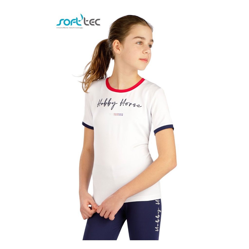 Pohodlný střih s delším zadním dílem a kulatým výstřihem. Barevný potisk koně v reprezentačních barvách. Nápis Hobby Horse s kamínkovou trikolórou. Vysoce kvalitní funkční materiál zaručuje vysoký komfort při celodenním nošení. Materiál je velice lehký, prodyšný, pružný a rychleschnoucí. Vhodné pro aktivní sporty. 94% PES coolmax all season soft'tec + 6% Elastan/Lycra 100 bílá 152, 158, 164Doplňkové parametry