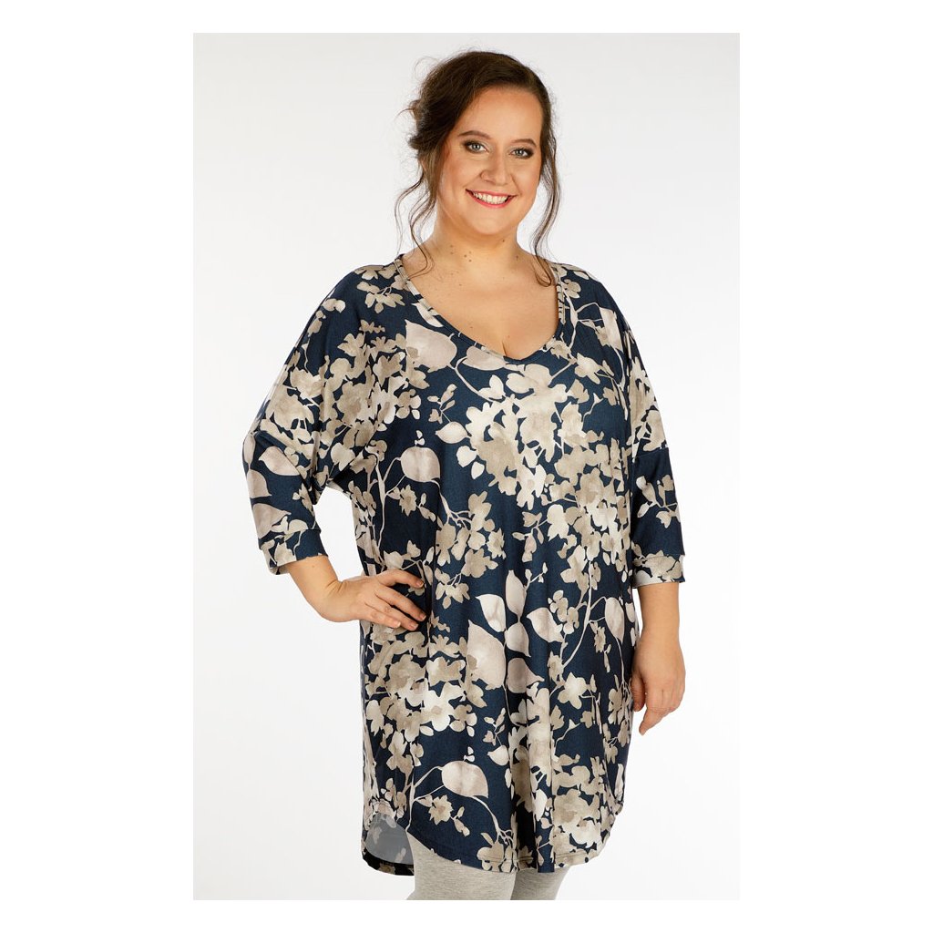 Tunika volného střihu s kimonovým rukávem do manžety a hlubším výstřihem do V. Velmi splývavý a pružný nemačkavý materiál Vám zajistí maximálně příjemný pocit při nošení. Tuniku v originálním tisku nabízíme ve větších velikostech. Délka tuniky cca 95 cm. 95% Polyester + 5% Elastan béžová kytka na tmavě modré XL, XXL, XXXLDoplňkové parametry