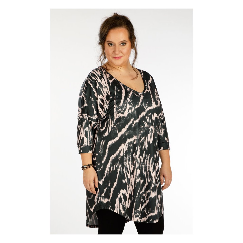 Tunika volného střihu s kimonovým rukávem do manžety a hlubším výstřihem do V. Velmi splývavý a pružný nemačkavý materiál Vám zajistí maximálně příjemný pocit při nošení. Nabízíme ve větších velikostech. Délka tuniky cca 95 cm. 88% Polyester Micro + 12% Elastan/ Lycra tisk XL, XXL, XXXLDoplňkové parametry