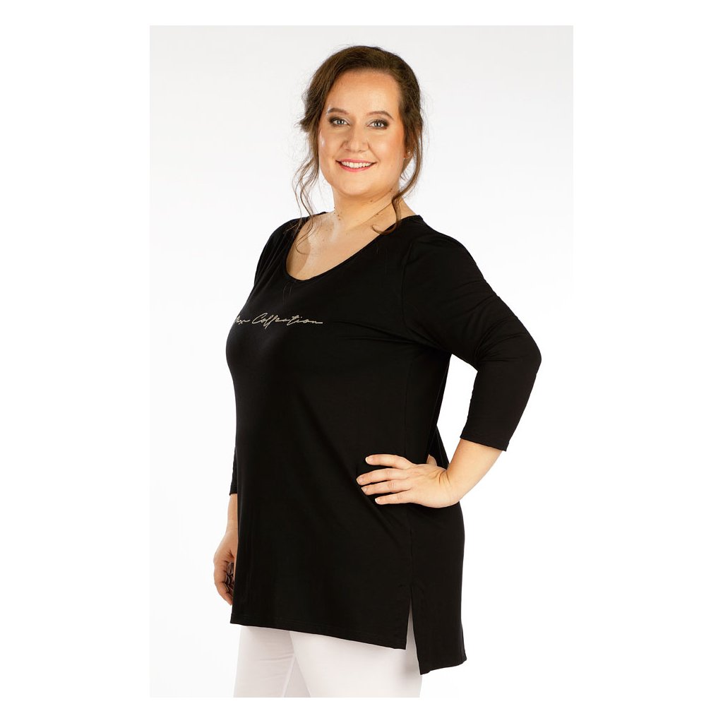 Kulatý výstřih a zlatý nápis na předním díle. Rozparky na bocích. Modalový materiál je příjemně měkký a hladký na omak. Je pružný a při nošení velice komfortní. Velmi dobře kombinovatelný kousek zejména s našimi legínami. Tuniku nabízíme ve větších velikostech. Délka tuniky cca 85cm. 92% Micro modal + 8% Elastan 901 černá XL, XXL, XXXLDiskuze